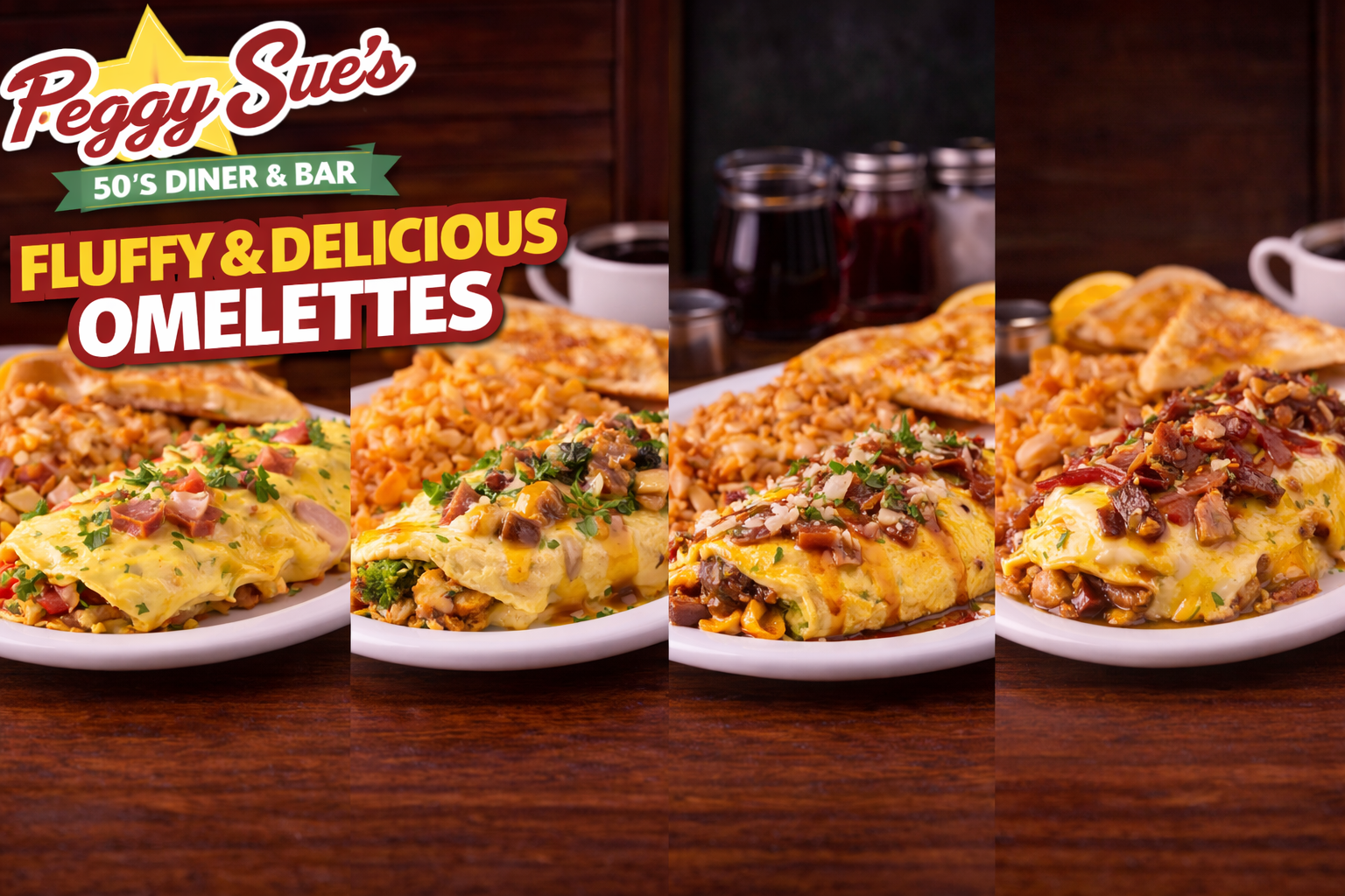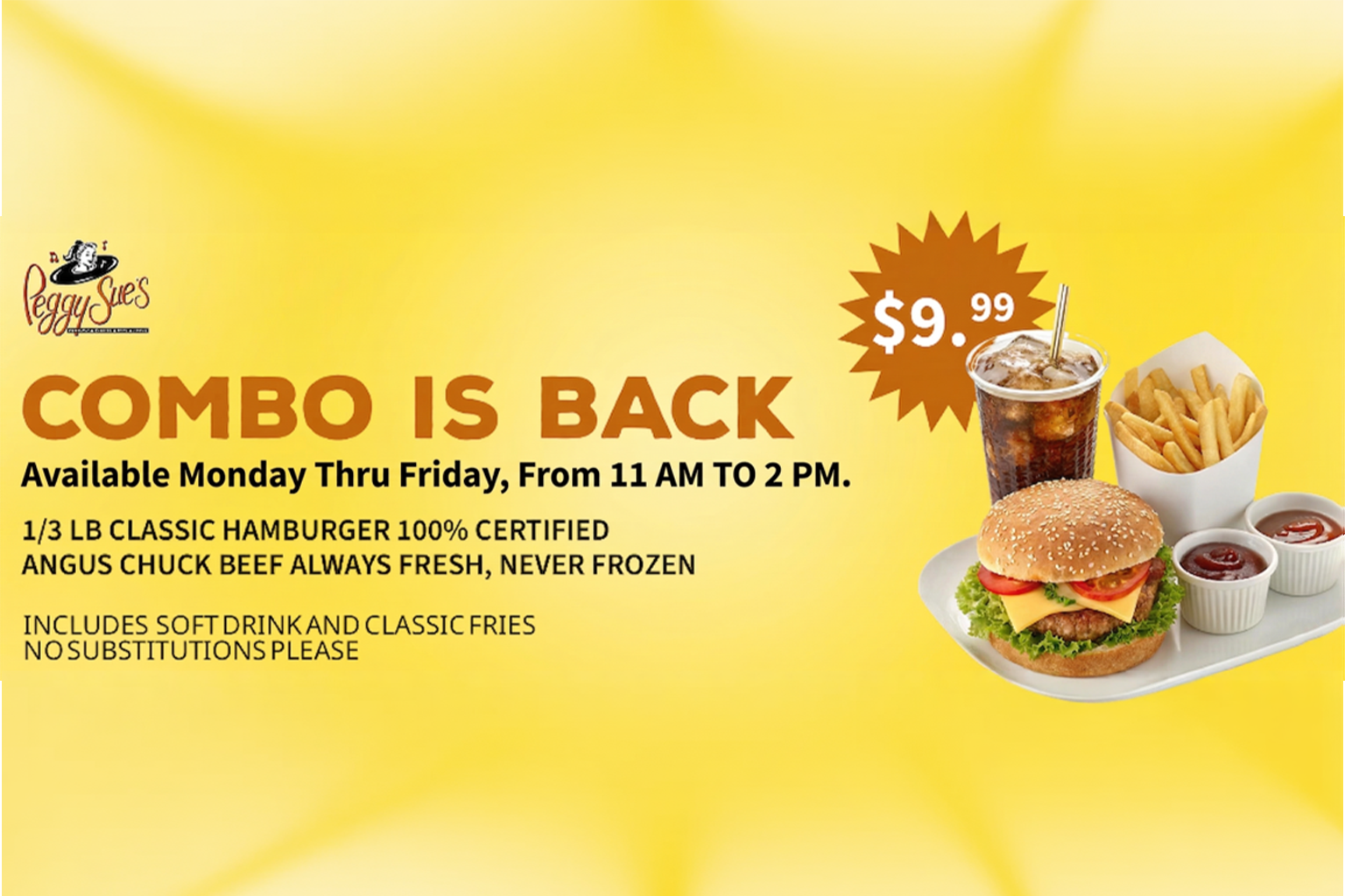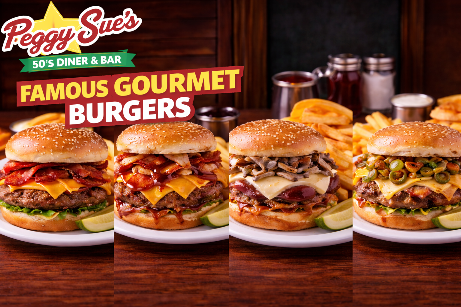 Born from a forgotten era, Peggy Sue’s strives to provide a nostalgic and exceptional dining experience. Our 100% Certified Angus Chuck Beef burger patties are always fresh and never frozen. Our burger patties are hand formed in our kitchen, served with fresh slices of california tomatoes and crispy lettuce, and then served on warm burger buns.