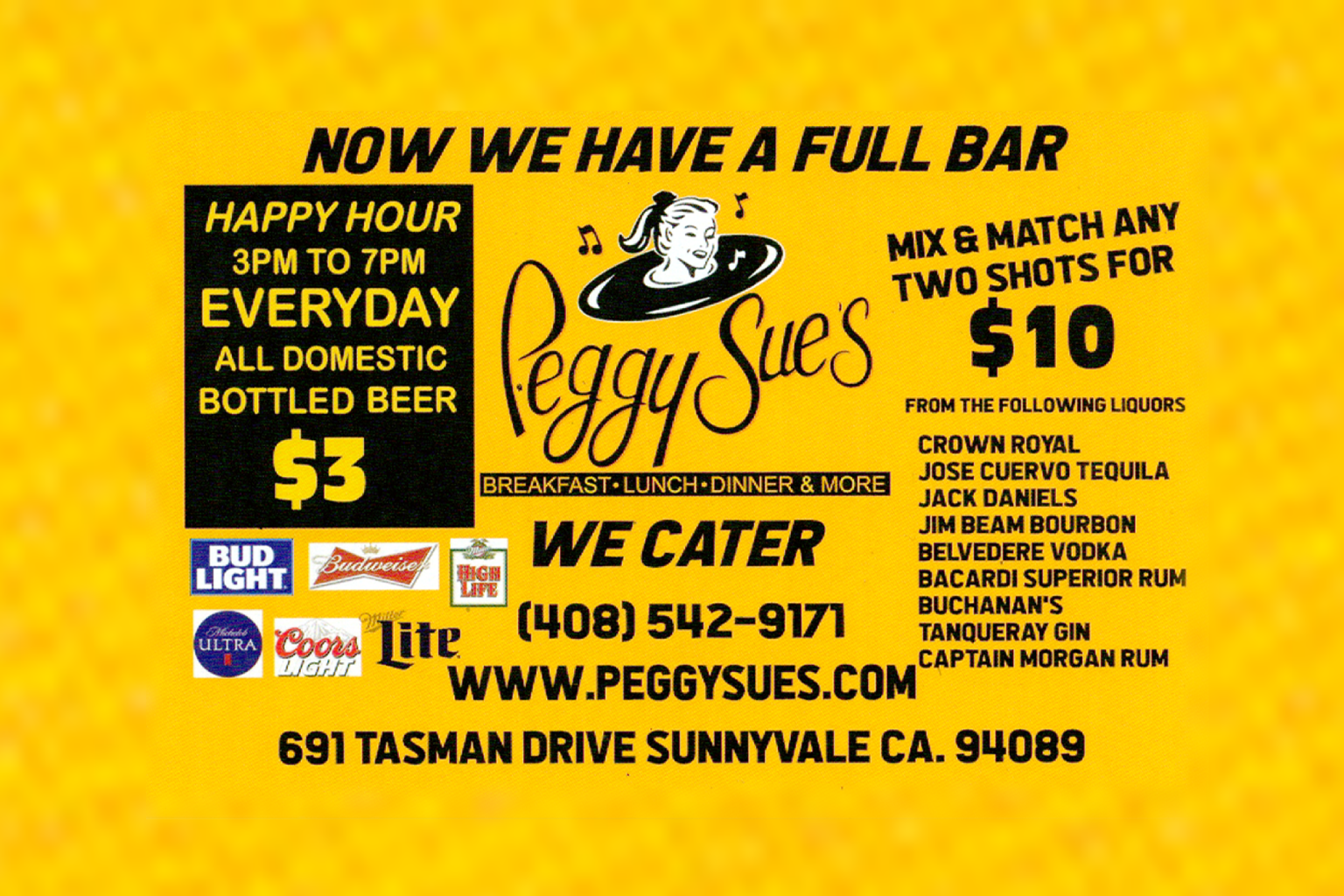 We believe here at Peggy Sue’s that our customers should experience the best of Silicon Valley. Peggy Sue’s you will be transported to the era of shakes, fries, burgers, and more. We now have a full bar, so be ready to explore a variety of cocktails and spirits.